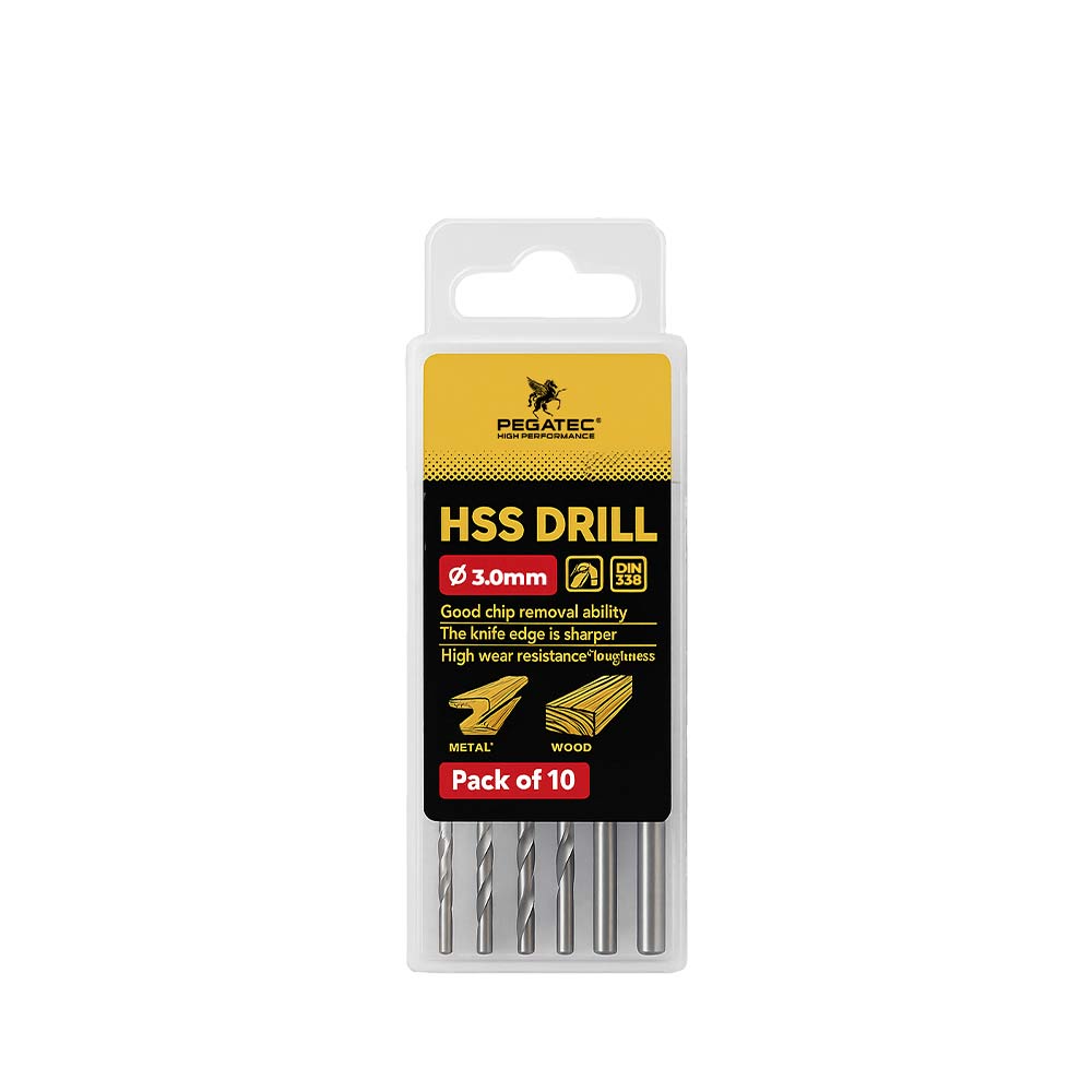 La Broca para Metal PEGATEC de 3.0 mm está fabricada con acero rápido (HSS) de alta calidad y recubierta con revestimiento amarillo y negro, lo que garantiza mayor durabilidad, resistencia al calor y al desgaste durante los trabajos más exigentes.